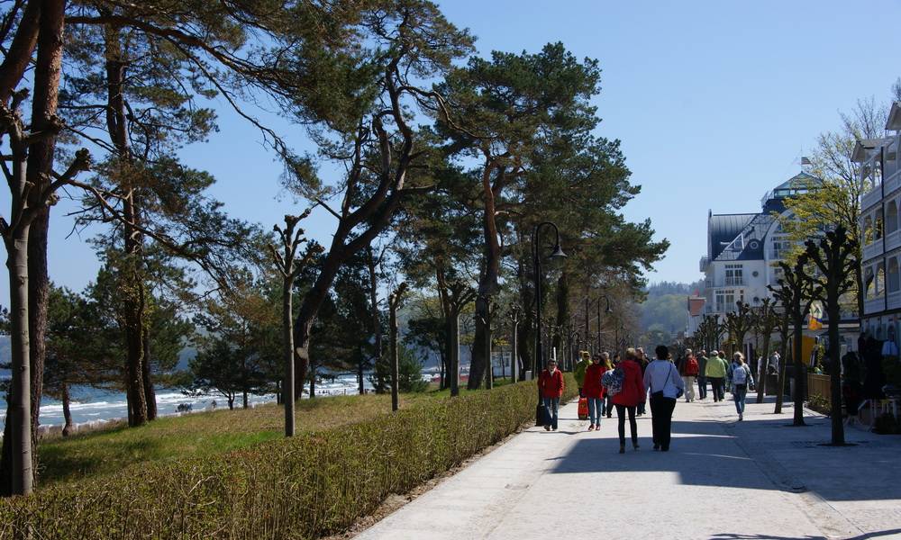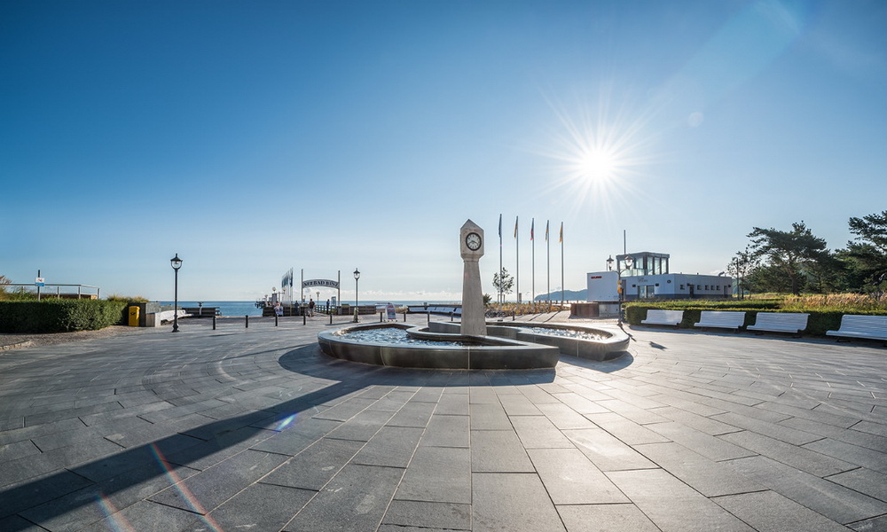 The walk continues to the pier where you have a wonderful view of the Bay of Binz with the Baltic Sea beach, the beach promenade with Wilhelminian villas and the Kurhaus. Continue towards the Kurhaus on the Kurhausplatz with pavilion and seating. The beach promenade towards Prora is lined with restaurants and shops located in the villas of the Binz spa architecture. On the right, there is a beautiful view of the pier behind and the Baltic Sea beach. At regular intervals along the beach promenade there are exits directly to the beach. From there you have a fantastic view of the Binz Bay with its fine sandy Baltic Sea beach.