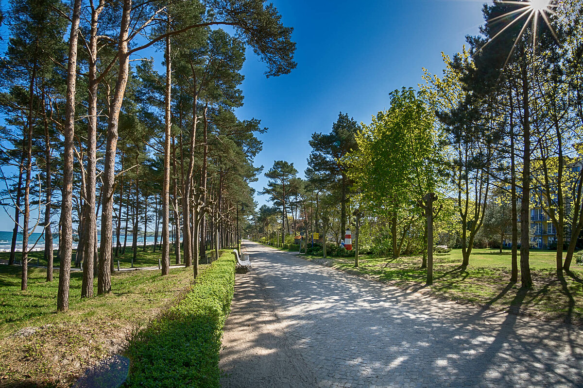 Die Strandpromenade in Binz ist ist eines der kulturellen Zentren und Mittelpunkte des gesellschaftlichen Lebens und dient als Flaniermeile mit hohem Freizeitwert. Als Vorbild beim Bau um 1895 dienten die großen europäischen Seebäder. Auch in Binz sollte beim Spazierengehen immer ein Blick auf den Strand und die Ostsee möglich sein. Die Promenade wurde Mitte der 90 iger Jahre renoviert und rekonstruiert und ist südlich der Seebrücke Richtung Fischerstrand ca. 700 m und nördlich vom Kurhausplatz Richtung Prora ca. 3,2 km lang.